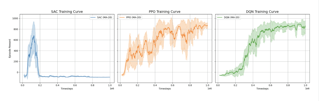 I implemented the DQN agent, helped standardize the training setup across all agents, and analyzed learning curves to compare performance. Rather than focusing only on final results, I spent time understanding why certain agents struggled or succeeded, especially how design choices like action space and reward structure affected learning. This project helped me build a stronger intuition for experimentation, debugging learning systems, and clearly communicating technical results to others.